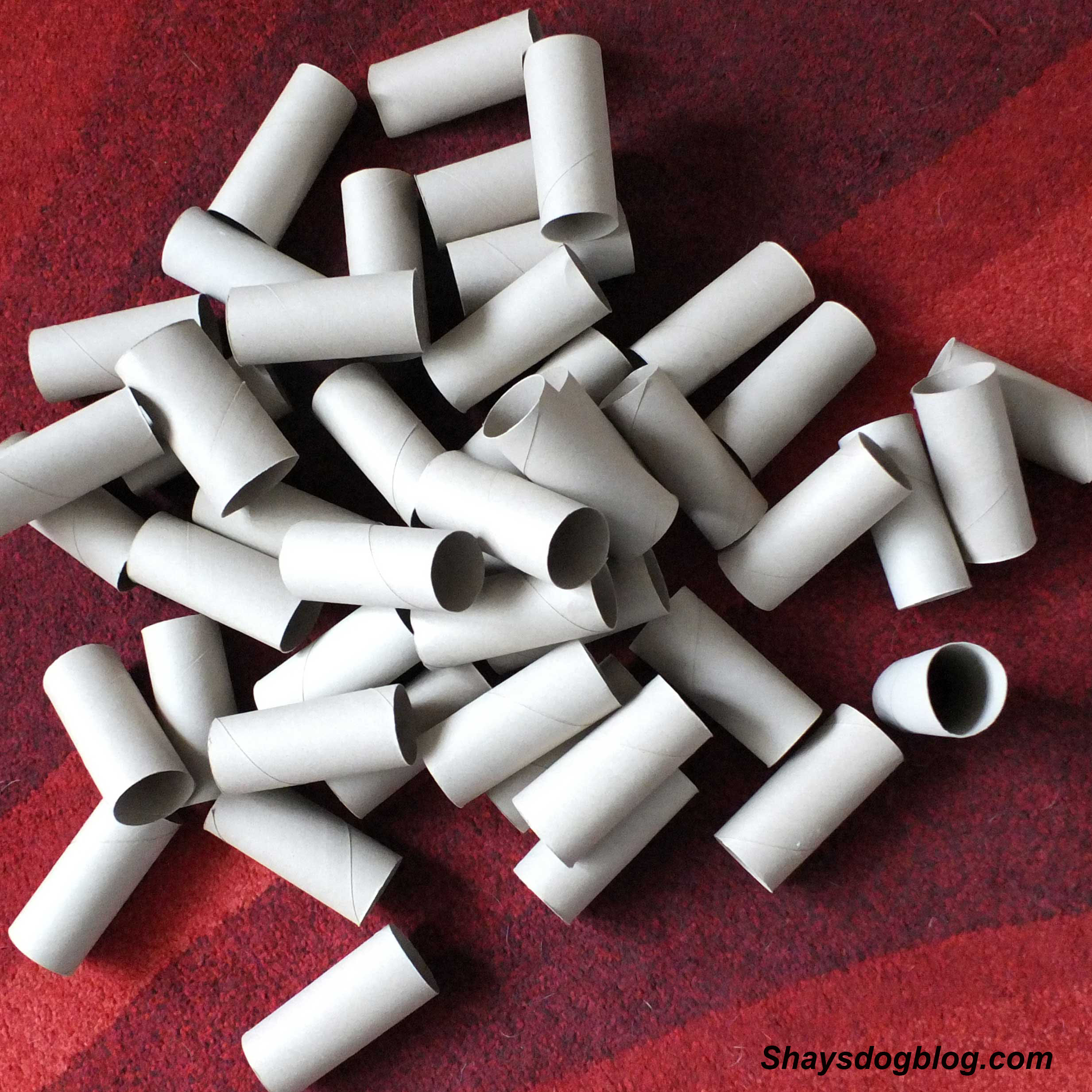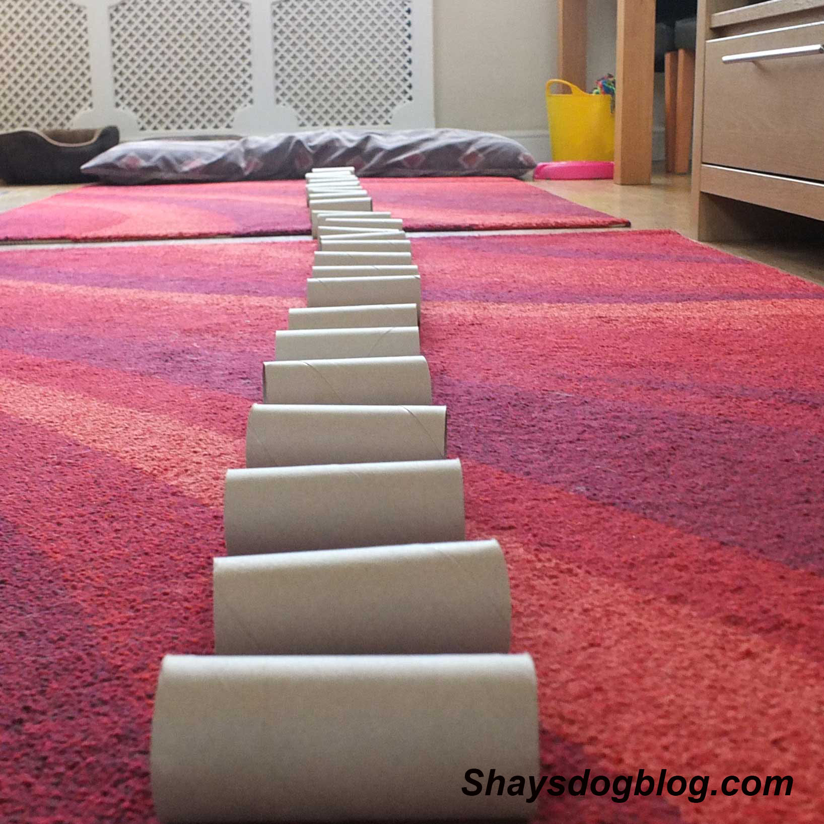 Place them on the floor, place a piece of kibble (or whatever you are using) in every other tube (half of them) and let the dog find them all.  It takes a while to save so many tubes (patience is a virtue), but you could ask friends to save them for you too or you could use your imagination and substitute the tubes with something else.